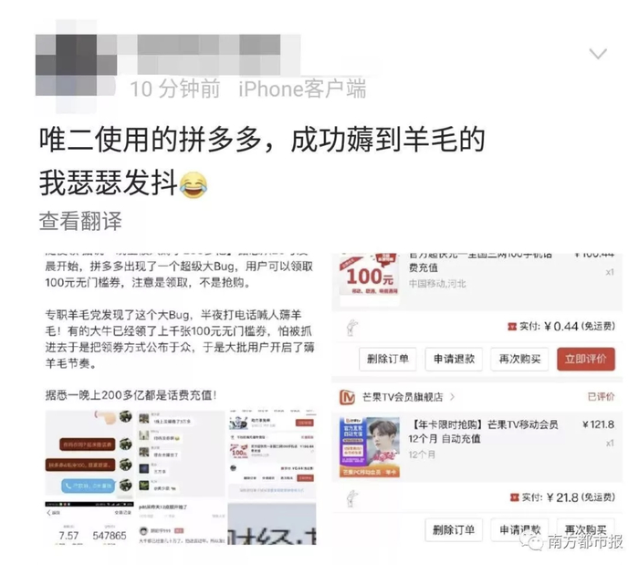 拼多多Bug:羊毛党连夜抢券,4毛钱充100快话费