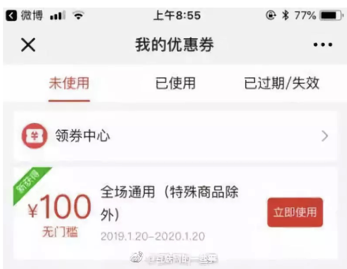 该平台被曝出现重大Bug,用户可领100元无门槛券。这一漏洞引来了大批用户“薅羊毛”,并全部将优惠券用作话费充值。甚至有网友连夜打电话给朋友起来捡便宜。