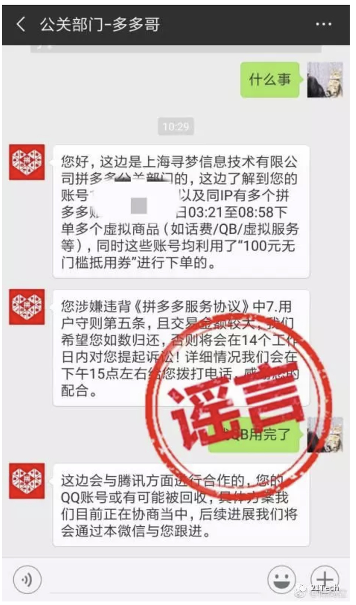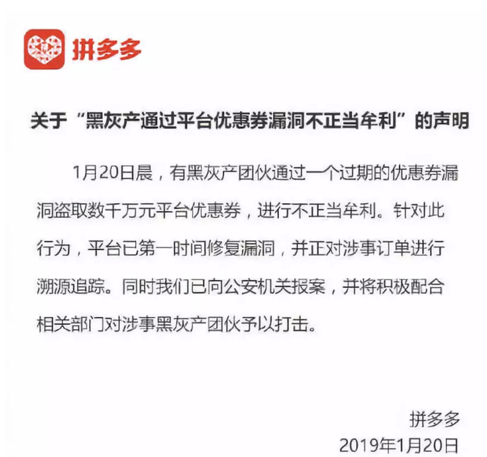 不过,对于网络上流传的客服与用户之间对话的截屏,拼多多说是谣言。“有黑灰产团伙通过一个过期的优惠券漏洞,盗取数千万元平台优惠券,进行不正当牟利。网络流传的截图均为伪造,具体的数额不便透露。”