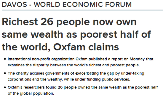 全球贫富差距惊人:最富26人与最穷38亿人资产相等