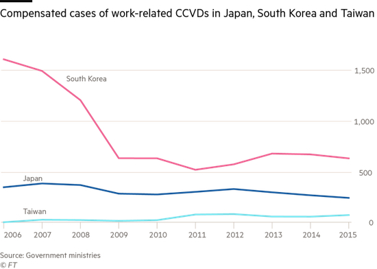 中国并非东亚地区唯一一个工作时间过长引起担忧的国家。2014年发表的一篇学术论文显示,“过劳死”(Karoshi,日本对因为工作过度劳累而死亡的叫法)在东亚各地已成为一个突出现象,只是在对过劳死予以恰当的承认和为失去亲人的家属提供恰当补偿方面,中国似乎仍落后于周边的日本、韩国和台湾等国家和地区。