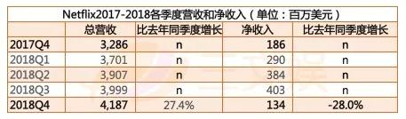 2018年Q4,Netflix营收41.9亿美元,同比2017Q4上涨27.4%。净收入为1.34亿美元;新增付费会员数创下纪录,达到880万。