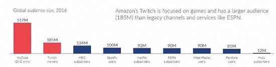 亚马逊的游戏视频直播网站twitch.tv对于Netflix来说也是另一场噩梦。在游戏时间之外,如果用户想看点什么视频的话,看游戏直播这样看起来更相关的视频观看活动更会挤占掉在Netflix追剧的时间。特别是twitch正前所未有的火爆起来 —— 星期六的凌晨三点钟,依然有150万的用户正在twitch上观看前21位的直播视频。而根据SuperData 2016年的报告,twitch的体量早已超过Netflix和HBO。