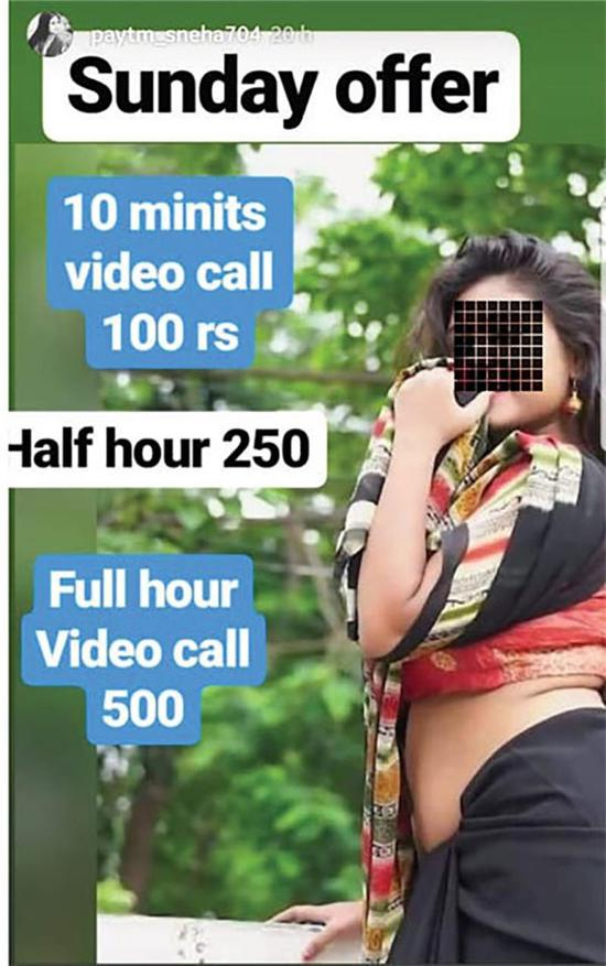 这位用户声称,5分钟的视频通话收费100卢比(9.5元左右)、10分钟150卢比、15分钟180卢比、20分钟220卢比、半小时300卢比、一小时500卢比。感兴趣的买家打一个电话需要200卢比(不含图片),用图片进行性爱聊天需要150卢比一个小时。语音和视频通话将在WhatsApp上进行。