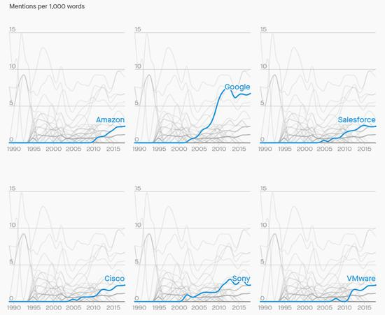数据来源:Quartz分析了1989年至2018年微软财报中提到超过10次的竞争对手。