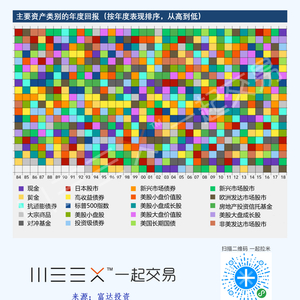 下图统计了1984年至2008年期间每年各类资产的表现,每类资产分别用不同的颜色标示。图片来源于富达投资,由WEEX一起交易汉化。