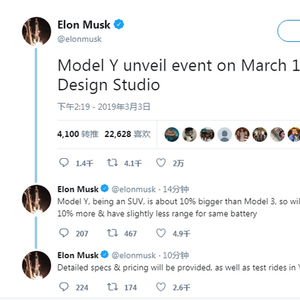 他还表示在发布会上将提供详细的规格和价格信息,且将进行Model Y试驾。