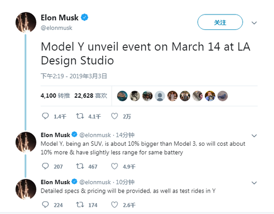 马斯克称将于3月14日在在洛杉矶发布Model Y