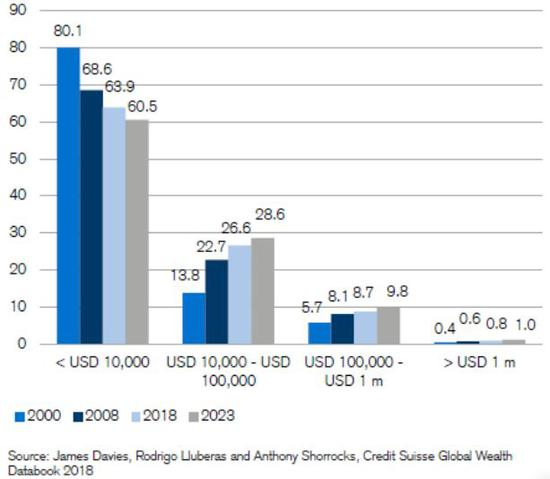 (1) 拥有少于1万美元财富的成年人比例从2000年已开始降低:世纪初这一比例为80%,如今人群比例已从世纪初的14%升至今天的27%,预计到2023年将为29%。