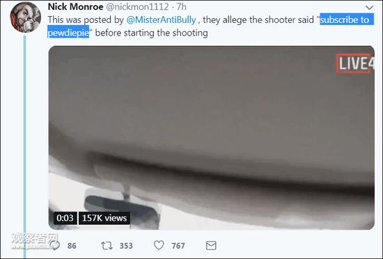 需要注意的是,视频中枪手下车行凶前还“蹭了一波流量”。他当时说,“大家记住,要关注PewDiePie”,而后者目前是Youtube最大网红,粉丝数已超8947万人。