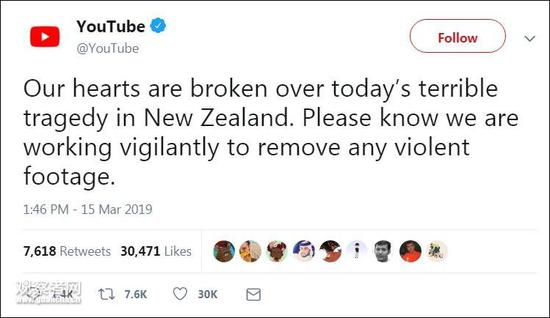 Youtube这条推特发布于15日下午1:46分。而截至发稿,观察者网测试发现,仍可通过简单搜寻关键字的方式,在该平台找到行凶视频。