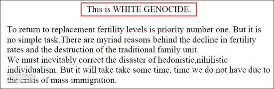 此外据《卫报》消息,一个疑似作案嫌疑人的推特账号,事发前还发布了一份长达74页的“行凶自白书”。里面不仅详细介绍了自己的出生,阐明其极端政治立场,还疑似透露了此次作案的动机:反对移民对白人的“种族屠杀”。不过该“自白书”没有署名。而该推特账号下有大量的极端言论,以及很多枪支照片。