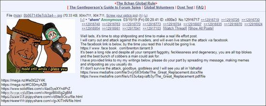报道称,事发前几个小时,作案嫌疑人塔兰特(Brenton Tarrant)在极右翼论坛8chan上,预告自己将要“发起攻击”,明确指出自己将“直播全过程”,并附上脸书账号链接。