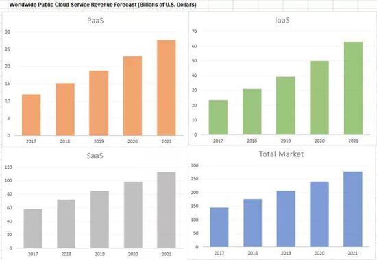 亚马逊在IaaS领域如今已占据主导地位,但是PaaS和SaaS仍然有机会。未来几年,整个公共云市场预计将大幅增长,2019年将增长17.3%,其中IaaS是三个市场中增长最快的部分,预计将增长27.6%,总市值将达到400亿美元。根据Gartner的预测,SaaS仍然是最大的市场,预计2019年将达到850亿美元的价值。