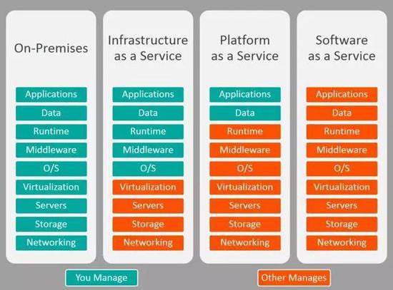 下图详细说明了三种服务之间的差异。IaaS是最灵活的模型,它为企业提供了基于预期消费进行购买的机会,并且具有很高的可伸缩性。例如AWS、Azure和谷歌云平台。PaaS允许开发人员构建定制的应用程序,提供“软件创建平台”。例如Heroku和Google App Engine。SaaS是通过Web平台交付信息,例如Dropbox和Salesforce。