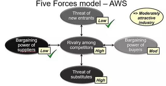 云计算行业在不断变化,但亚马逊占据了很大的市场份额。新进入者的威胁相对较低,因为通过大的资本要求和客户对三大品牌之一的忠诚度,进入壁垒较高。但随着微软和谷歌云平台的增长以及切换成本的降低,他们的替代品的威胁对亚马逊是一个巨大的威胁。由于这个原因,三大玩家之间的竞争也很激烈。
