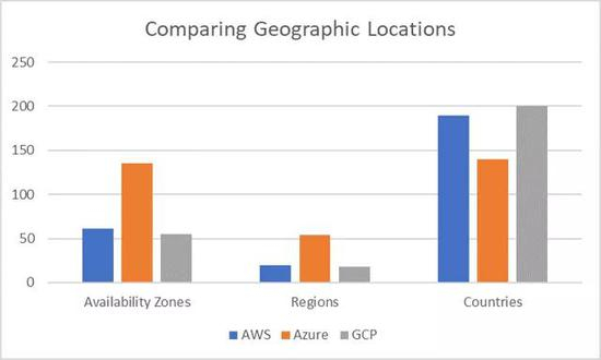 从地理上看,AWS分布在190多个国家,并且还在不断发展。AWS在20个可用区域(Availability Zones)和61个地域(Region)。Azure有54个地域,每个地区托管2-3个数据中心,他们没有直接列出可用区的数量,但是根据区域和数据中心计数,估计微软有135个可用区域。GCP则拥有18个可用区域,55个地域。