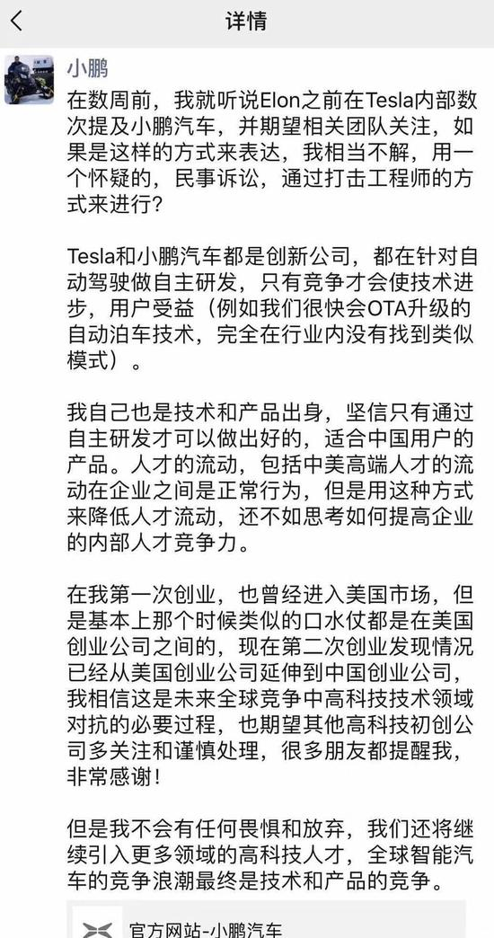 小鹏汽车创始人何小鹏也在朋友圈回应:“在数周前,我就听说Elon之前在Tesla内部数次提及小鹏汽车,并期望相关团队关注,如果这次是这样的方式来表达,我相当不解,用一个怀疑的民事诉讼,通过打压工程师的方法来进行?”