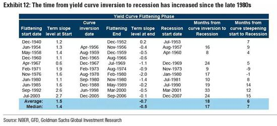 高盛在另一份研究中进一步研究了收益率曲线与衰退的关系,发现: