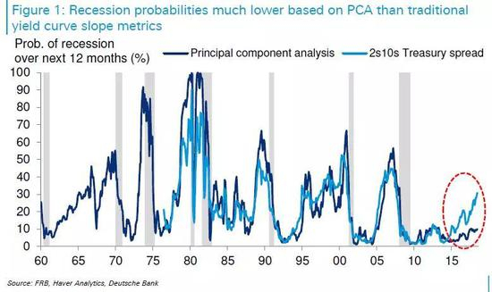 德银认为,如果只关心即期收益率曲线提供的衰退信息,那么使用主成分分析之后的收益率曲线比期限利差能够更好地预测未来一至两年的衰退概率:未来一年美国经济陷入衰退的概率约为10%,未来两年为25%。(相比之下,期限利差显示的衰退概率分别为近30%和近50%)