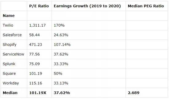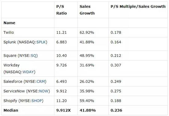 Twilio显示最高的收入增长率。让我们使用一个更适合Twilio的增长率的P/S比率来分析Twilio。