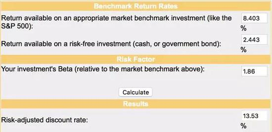 假设Beta系数为1.86(取过去三年杠杆Beta系数和非杠杆Beta系数的中位数),10年期收益率为2.443%,股票风险溢价为596个基点。