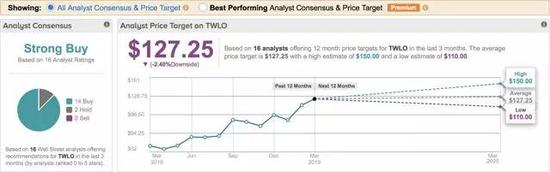 Twilio是由16名分析师覆盖,其中14名有买入评级,只有两个持有评级。这16位分析师都没有卖出评级Twilio。不过,分析师的共识是每股127美元,较当前市场价格下跌。为什么分析师会建议客户购买他们认为正在下跌的股票?不可避免的是,分析师要么(a.)下调该股评级,导致交易势头逆转,要么(b.)在没有新的势头的基础上上调其价格目标。两者必有其一发生。如果几位分析师将其评级从买入下调至持有,可能会导致股价从高点回落。