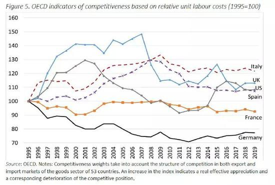 许多因素都会影响工人的议价能力。首先,最重要的是制度因素,比如工会力量、集体谈判协议的范围和劳动法等。一个很经典的案例就是德国,它通过持续限制工资增长,维持了制造业的出口竞争优势 (下图)。始于1990年代下半叶的工资制定权力分散化,意味着大多数工资合同逐步由公司一级决定。此外,工会密度的大幅下降,削弱了有组织劳工的谈判能力,造成了全行业协议占比的下降。