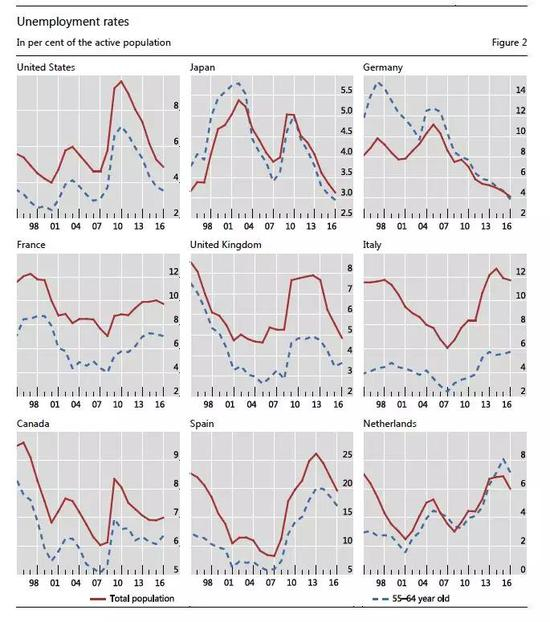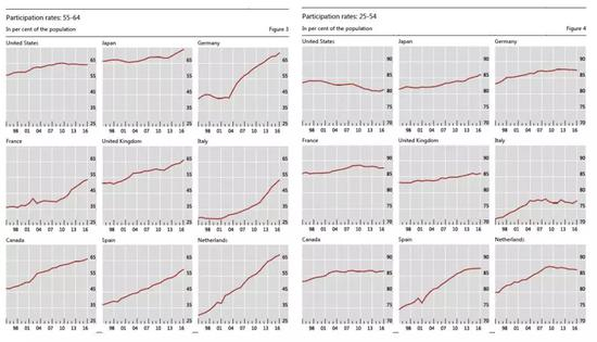 具体来说,2013-17年,欧元区创造的6至7百万个就业岗位都来自50岁以上劳动力。在美国,55岁以上员工占劳动力的比例几乎翻了一番,从1995年的12%升至2016年的23%。在日本,自2007年以来,即使是65岁以上的劳动者也增加了近400万。在过去十年中,OECD成员国中55-64岁工人的参与率从33%上升到55%。在德国,这一比例从2003年的40%左右上升到2016年的70%以上。