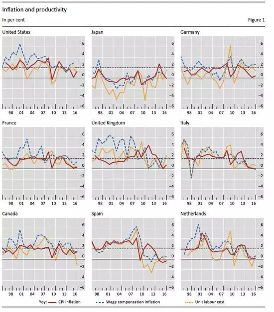 2008-09年的“大衰退”已过去近10年,大多数发达经济体的名义工资增幅仍明显低于衰退前水平。2013年后的这波复苏也始终未能转化成“正常的”通胀水平。欧元区的核心通胀率仍接近1%,日本的核心通胀率已从零升至1%,美国情况略好,核心通胀在持续复苏后接近2%。不过,大多数其他发达经济体几乎没有通胀。核心CPI通胀、GDP平减指数通胀以及经生产率调整后的工资通胀均保持在1%附近,而非危机前2%的名义锚 (图1)。
