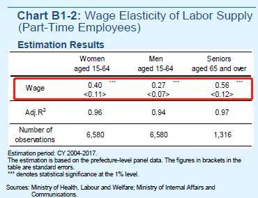 日本央行的数据显示,老年劳动供给的工资弹性是15-64岁男性劳动力供给的两倍 (下图),这也解释了为什么尽管失业率稳步下降,日本的工资却停滞不前。换句话说,在工资增长率相同的情况下,老年人将提供更多的劳动力,这反过来又抑制了工资的增长。如果老年劳动供给没有弹性,工资增幅可能会更大。