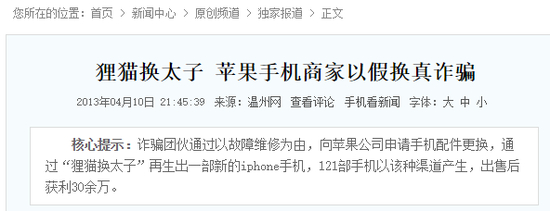 而这一行当可行的前提,是苹果长期保持“只换不修”的售后政策。据温州网2013年报道,当年4月,警方曾破获一起利用假配件向苹果公司“以假换真”的团伙诈骗案件。该犯罪团伙通过钻苹果售后服务的漏洞,向苹果公司诈骗了121部iPhone4S手机配件,从中获利近30余万。