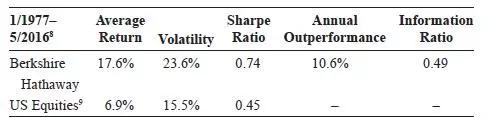 我们先看看巴菲特的数据。AQR选取了巴菲特从1977到2016年的投资收益率数据,其中巴菲特的年化收益率17.6%,对比同期美国股票年化收益率6.9%,巴菲特取得了10.6%的年化超额收益率。当然,巴菲特因为通过伯克希尔哈撒韦保险公司的浮存金模式,加了1.6倍的杠杆,导致巴菲特的波动率也更大一些。从夏普比例看,巴菲特的夏普比例0.74,比指数的夏普比例0.45高了不少。