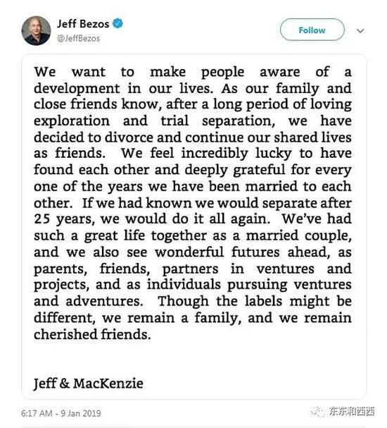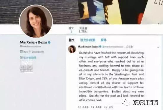 贝佐斯写道:麦肯齐是我最值得感谢的人,……她是如此睿智、优秀和有爱,永远值得我学习。↓↓