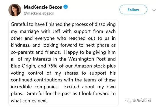 感谢每一个帮助我的人,我期待揭开人生新篇章,与杰夫以孩子父母和朋友的关系相处。我很高兴把在邮报、蓝色起源和亚马逊的股份给杰夫,支持他在这几家公司的卓越贡献。