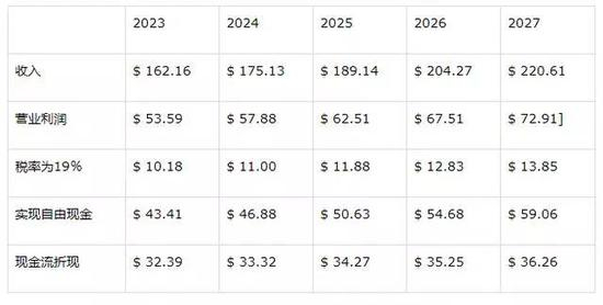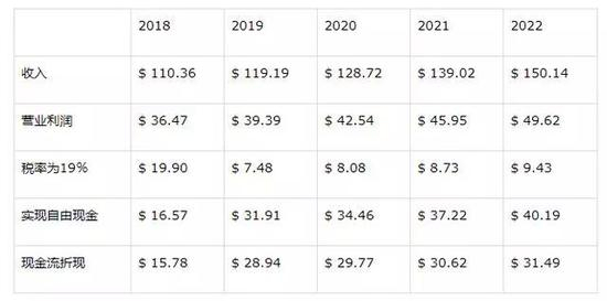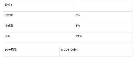 首先,值得注意的是上面表格中的数字是以十亿美元为单位的。 这个模型的其他假设包括8% 的增长率,这是基于过去五年的表现预测的,以及扣除2018年由于美国最近减税导致大量资本从海外流回美国而产生的巨额税收。 这为今后的项目提供了合理的基础,未来10年的增加值总额约为3080亿美元。