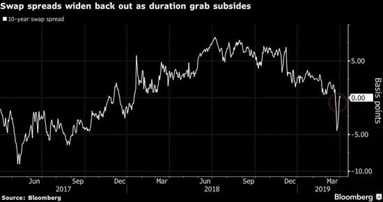 彭博数据显示,2019年3月末,美国10年期互换利差大幅下跌进入负区间,达到17个月未见之水平,而过去一年里它一直都是正值 (下图)。