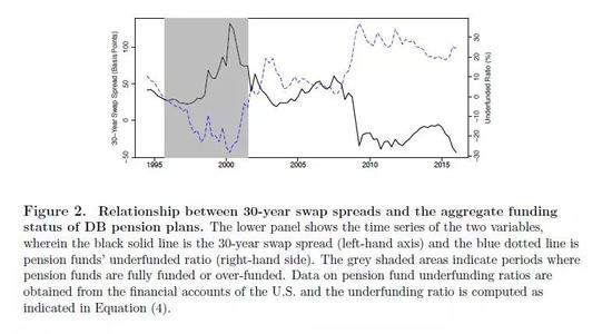 Swap curve远端的主要玩家都是保险公司和养老基金,它们自然需要获得期限较长的固定利率收益。美国2006年的《养老金保护法案》要求养老基金通过制定融资标准和补救措施,将资金缺口的状况降至最低。这促使养老基金进行积极的久期管理 (下图),即将资产和负债久期匹配,因为任何久期错配都可能导致未来的缺口。想要增加资产端久期,要么卖出IRS合约 (收到固定利率),要么购买长期国债。由于长期国债流动性不好,养老基金加久期的时候更青睐IRS。根据上面Box A的内容,我们可知大量卖出30年期IRS会压低swap rate,导致互换利差收窄。
