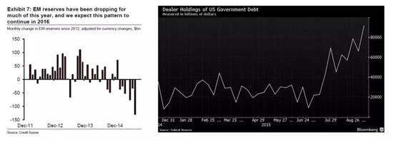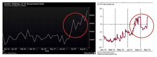 然而在现实中,上述套利交易并没有跟想象中一样发生。首先,最直接的一点是,3m Libor–GC repo利差在2015年7月后就开始迅速收窄并跌入负值 (下图右侧面板,注意图中是GC repo-Libor)。根据当时的市场报价,套利空间已几乎消失。3m Libor–GC repo利差收窄变负的短期原因是新兴市场国家大量卖出美国国债,交易商持有的国债库存增至平均水平的4倍 (下图左侧面板),而这些头寸都需要通过Repo进行融资 (质出国债换入现金),因此对现金需求的增加导致GC Repo利率飙升。 而抵押融资利率上升的长期原因,主要是交易商资产负债表愈发昂贵 (下文详述),交易商不愿意置入国债占有资产负债表空间,因此提高回购利率。
