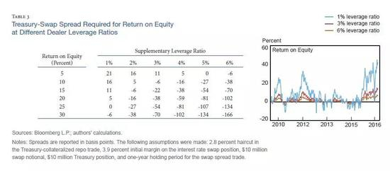 交易商一般都是通过基于某一特定交易的ROE盈利视角来评估交易的可行性,而ROE对资本消耗 (Capital charge) 非常敏感,而资本消耗又对SLR非常敏感。SLR上升或下降一个百分点都可能产生巨大影响。事实上,根据纽联储的估算,ROE受SLR的影响是非线性的,当SLR从3%提高到6%,ROE就出现了剧烈的下滑 (下图右侧面板)。这种较高的成本有助于解释为什么受到监管的交易商不太可能去套利,除非互换利差达到比过去负得多的水平,这样即使有资本消耗,交易也变得划算 (下图左侧面板)。不过,在2015年10月后,10年期互换利差平均也只有-11个基点。