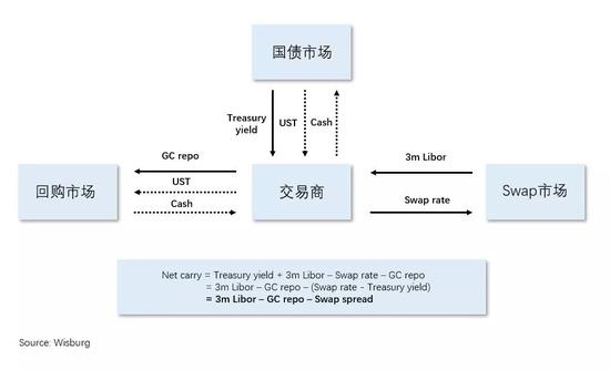 下面这个风格化的流程图清晰地展示这种套利交易的机制。具体来说,套利者可以选择持有长期国债多头,并通过回购交易 (GC repo) 为多头头寸融资 (下图中虚线),与此同时,再买入期限与之相匹配的IRS合约 (支付固定利率)。这样,套利者可以收到3m Libor和国债收益率,并支付GC repo利率和Swap rate,两部分之差就是套利空间。经过简单代数可知,套利空间 = 3m Libor – GC repo – Swap spread。由于在通常情况下,3m Libor–GC repo利差为正 (因为Libor是无抵押融资,repo是有抵押融资,而且当抵押品为国债时,风险非常低),因此当互换利差Swap spread为负时,存在充足的套利空间。当然,下面的模型有所简化,比如没有考虑折扣率的问题 (Haircut, 即从回购市场获得的cash小于购买国债UST支付的cash),以及没有考虑和CCP进行IRS交易时支付的保证金 (Margin)。这部分资金都需要从无抵押市场融资获得,因此套利者还需要额外支付一小部分融资成本,但总体上并不影响分析。
