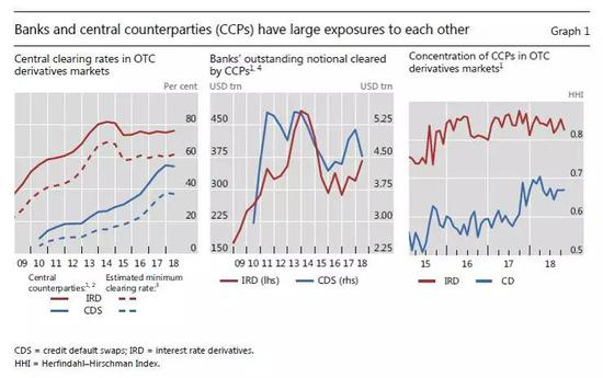 另一个被广泛提及的理由是,目前大部分互换交易都是通过芝加哥商品交易所 (CME) 和伦敦清算所 (LCH) 等集中清算的。通过使用中央对手方清算 (CCP),如今大多数互换交易的交易对手方信用风险已经大幅降低了,因为每个人都面临着一家更透明的大型清算所,而非一家单独的银行。根据BIS数据,利率衍生品 (IRD) 的中央清算率从2010年的20%左右上升到了2017年至少60% (下图左侧面板,红色虚线),且随着OTC衍生品清算业务的增长,CCP的市场集中度也越来越高 (下图右侧面板)。如果不再需要额外的对手方风险溢价,互换利差的收窄是可以理解的。
