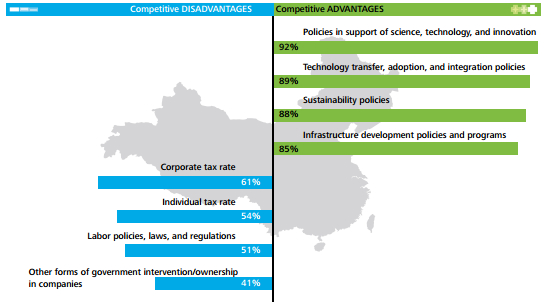 对于中国来说,鼓励创新、技术引进和转让、基础设施发展和可持续发展政策是最大的优势,而高税率以及某些低效的国企给发展拖了后腿。