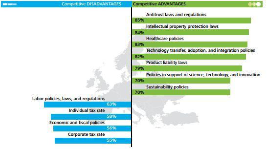 欧洲大陆的反垄断法和产品责任法,以及围绕知识产权保护、医疗、技术转让、可持续性和科学的政策,对他们来说是竞争优势。同样,高昂的税率以及财政货币政策在一定程度上成为了发展的制约因素。