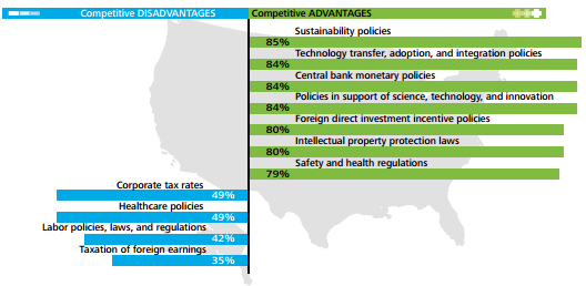 在政策方面,美国在可持续发展、技术转让和引用、货币政策、鼓励科学与创新、外国直接投资(FDI)、知识产权保护以及安全与健康监管等方面的政策有利于本土的制造业发展。而较高的税率、医疗政策、劳工政策成为较为不利的因素。