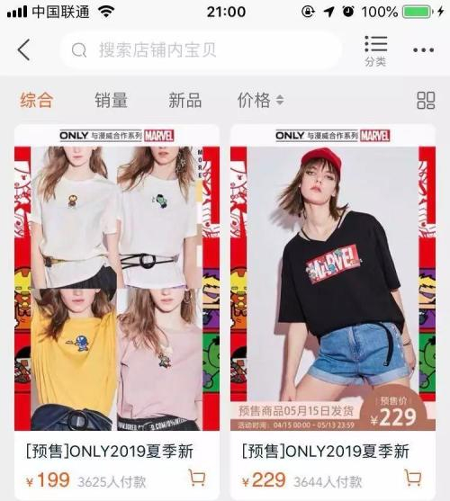 今年ONLY和漫威的联名T恤价格与ONLY平常衣服价格相当