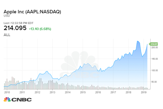 如果投资者在10年前投资 Apple(AAPL)股票,那么在现在能获得可观的回报。Apple周二(4月30日)发布财报后,其股价在周三(5月1日)上涨近5%,目前的股价在210美元左右徘徊。