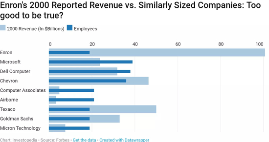 1998年到2000年,安然的营收从310亿美元猛增至超过1000亿美元,远远甩开当时规模相当的其他公司(包括微软和高盛)。