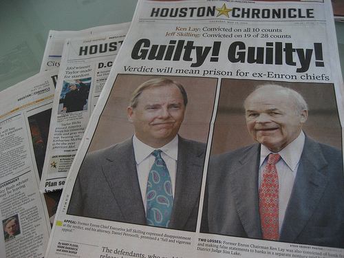在2006年5月26日的报道中,《休斯敦纪事报》高呼“有罪!有罪”,并配上了Jeff Skilling(左)和Ken Lay的照片