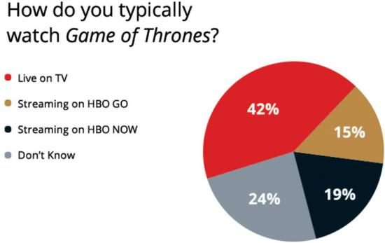 根据调查,42%的人在HBO电视台观看《权力的游戏》,15%在HBOGo上看,19%在HBO Now上看。看来,还是HBO Now更受欢迎一些。